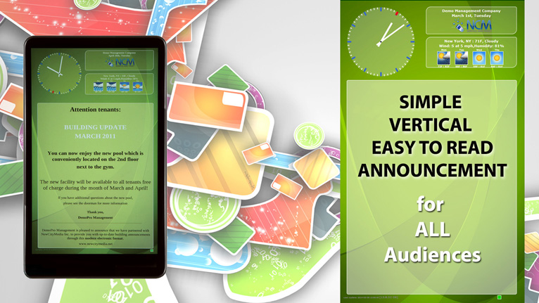 With NewCityMedia Content Managemant System you can easily create announcements yourself. No need to contact your IT guy, no need to pay someone to post you message. If you can use MS Word you will be able to create your own messages. And can add your existing Word, Excel, Powerpoint and PDF documents as well as pictures and videos.